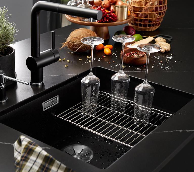 Kvalita předávaných kuchyní je pro nás prioritou, a proto spolupracujeme s firmou Blanco, jedním z předních výrobců kuchyňských dřezů. I tento výrobce má ve své nabídce překrásné keramické dřezy. K jejich výrobě využívá speciálně upravený materiál, a to keramiku PuraPlus®. A čím je speciální? Je hydrofobní, to znamená, že voda z povrchu odperlí a nečistoty nepřilnou.