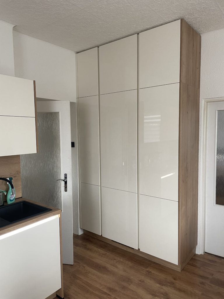 Přesně to se nám povedlo i u této bílé kuchyně v Plzni na Roudné. Majitelé si vysnili lesklá bílá dvířka a pracovní desku v dekoru světlého dřeva. Co ale se stěnou za kuchyňskou linkou? Za plotýnkami jsme zvolili lesklý bílý povrch, který se snadno omývá. Tam, kde stěna netrpí tak často a tolik, jsme si mohli dovolit dřevěný dekor. Elegantní, nápadité a hlavně praktické!