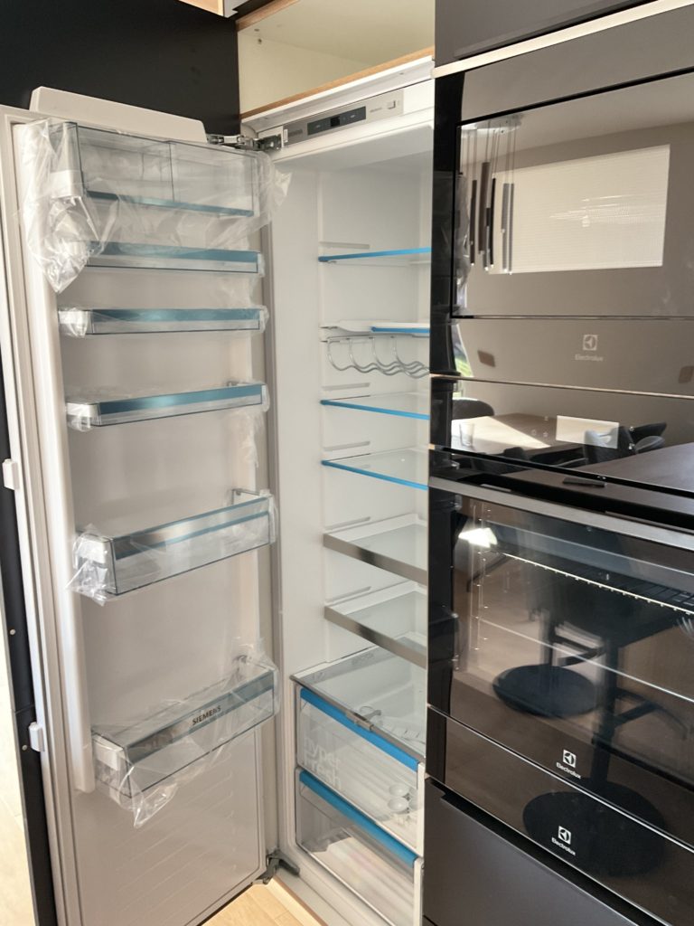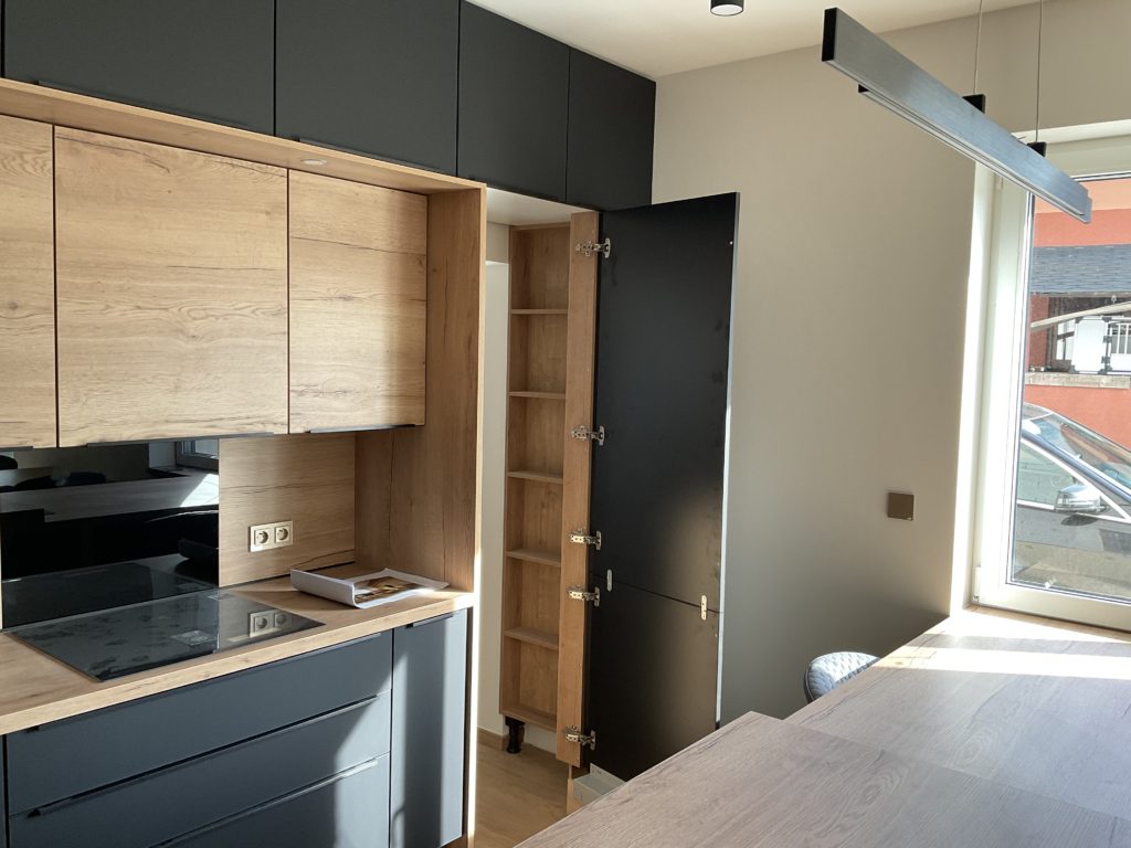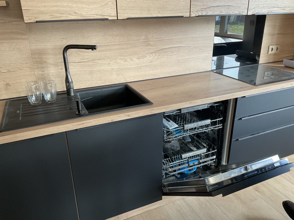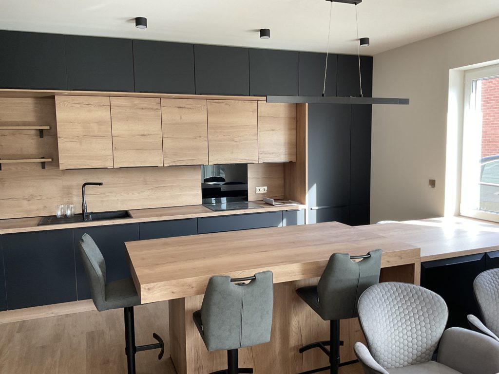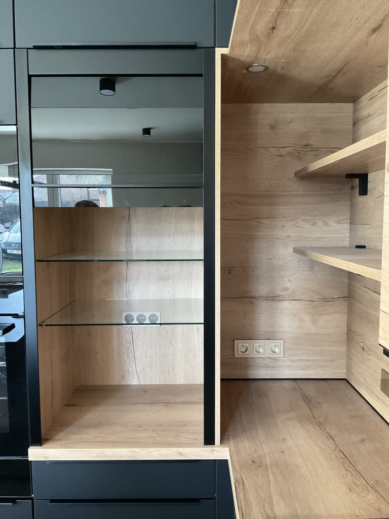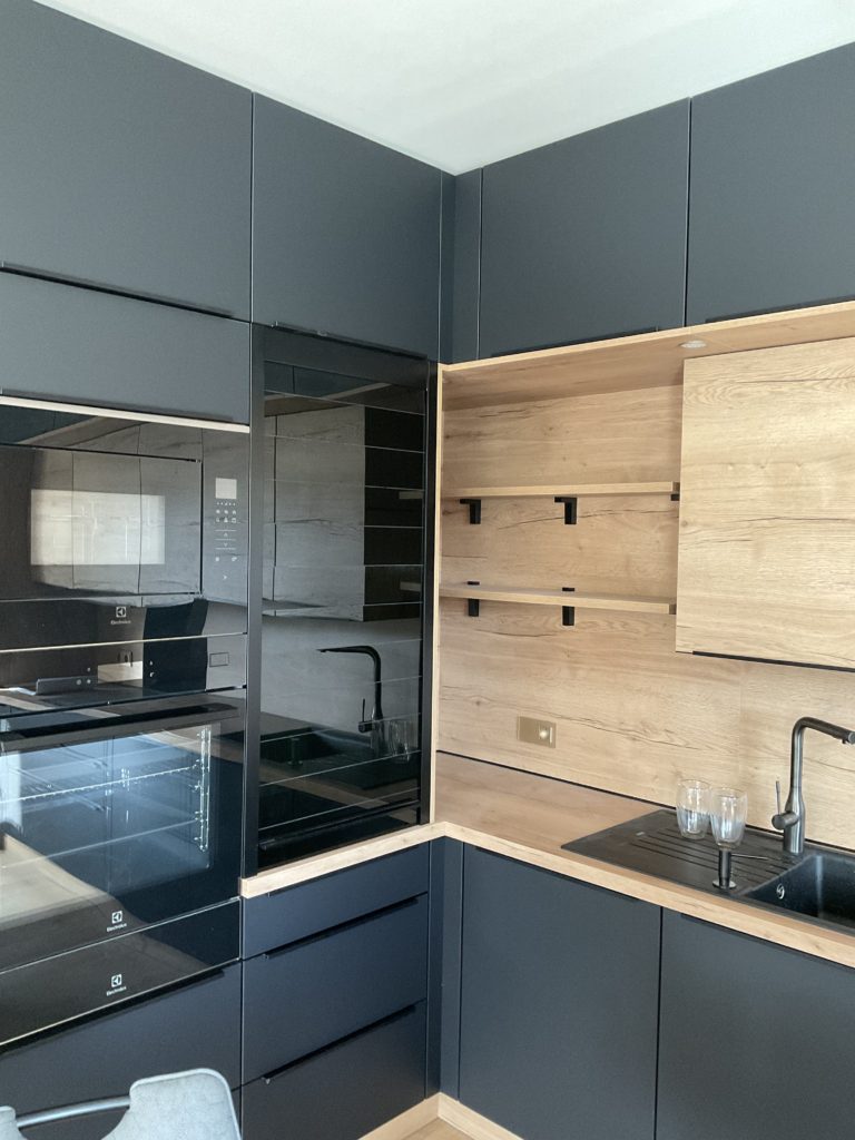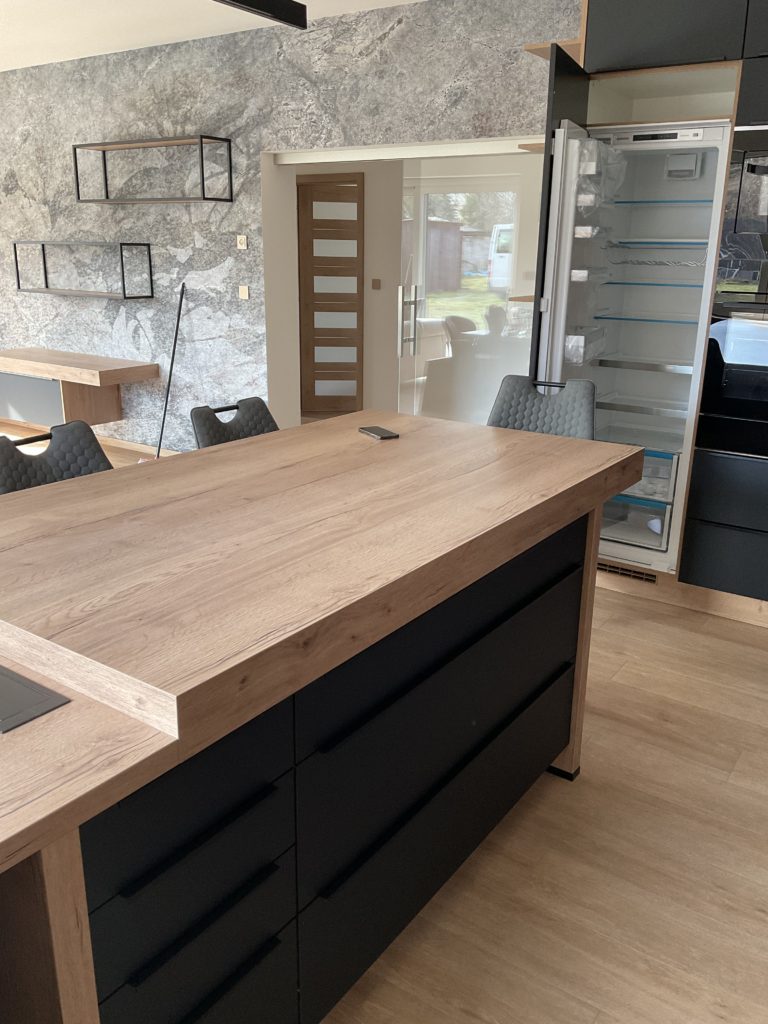 Na přání klientů jsme kuchyni vybavili dostatečným množstvím úložných prostorů - jako odborníci na kuchyně potvrzujeme, že dostatek skříněk a šuplíků je vždy dobrý nápad! Dalším velkým přáním klientů bylo designové sjednocení celého prostoru. Díky nábytku na míru to nebylo složité. Ze světlého dřeva jsme vyrobili jídelní stůl / barový pult, který efektně přechází v kuchyňskou linku. Kombinaci matné černé a světlého dřeva jsme využili i při výrobě velmi minimalistických skříněk a polic na stěnu v obývacím pokoji. Kuchyňskou linku, kde k celkovému minimalistickému rázu přispívají i takřka neviditelné lištové černé úchytky, jsme vybavili spotřebiči Electrolux s myčkou ComfortLift.