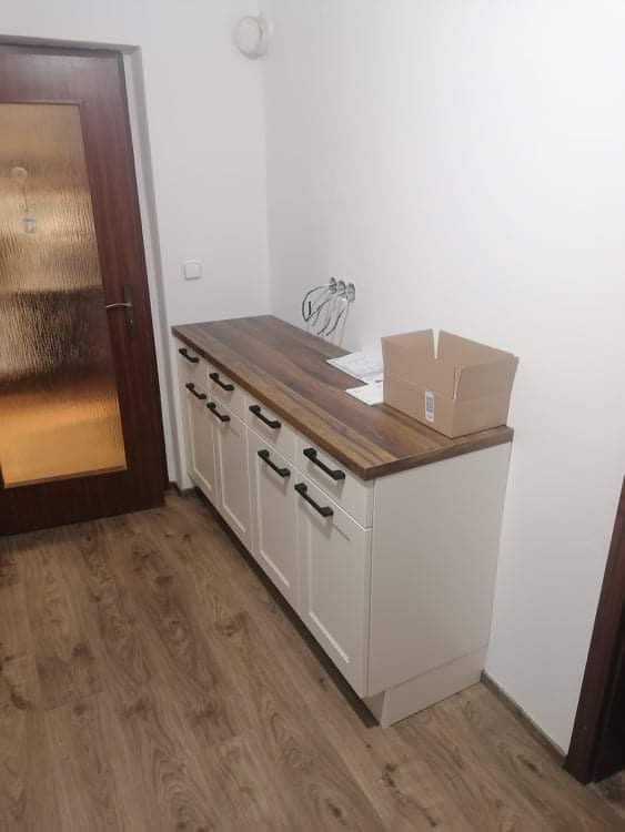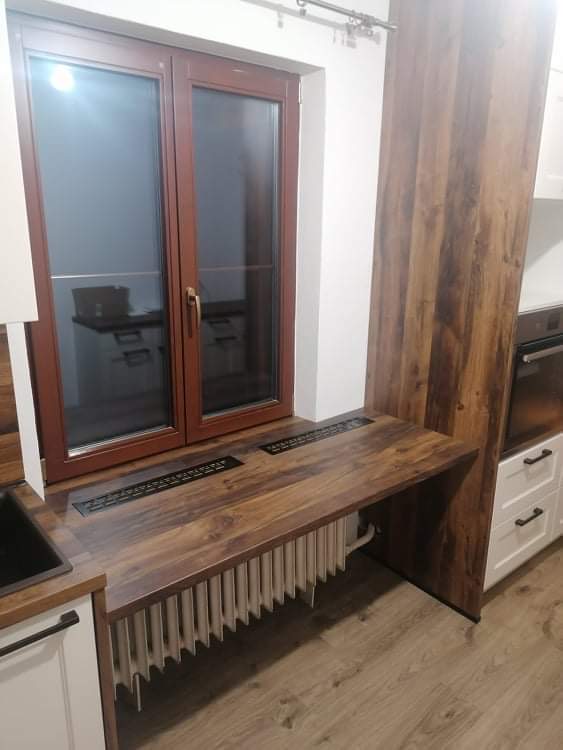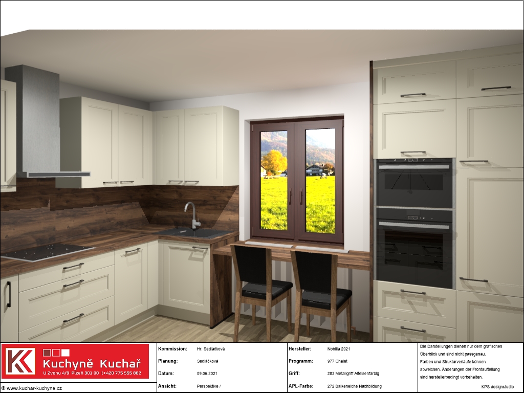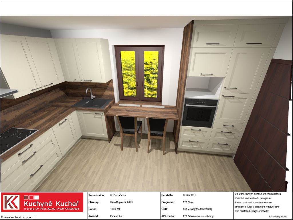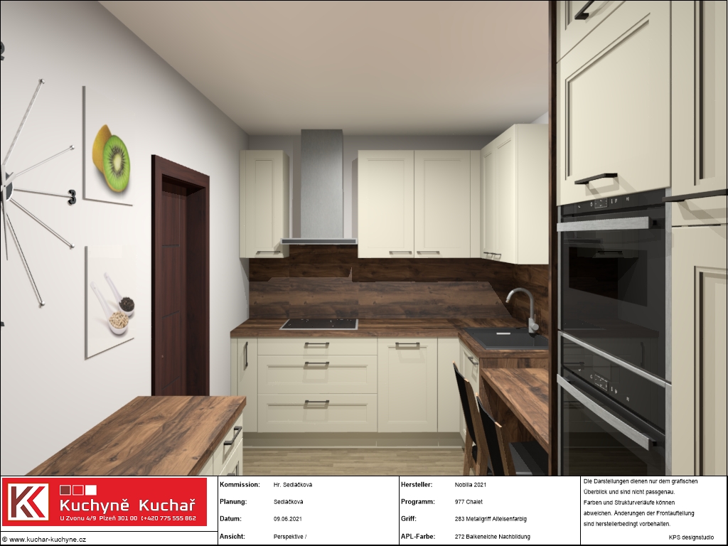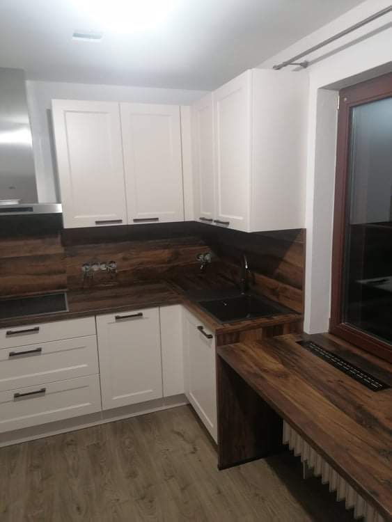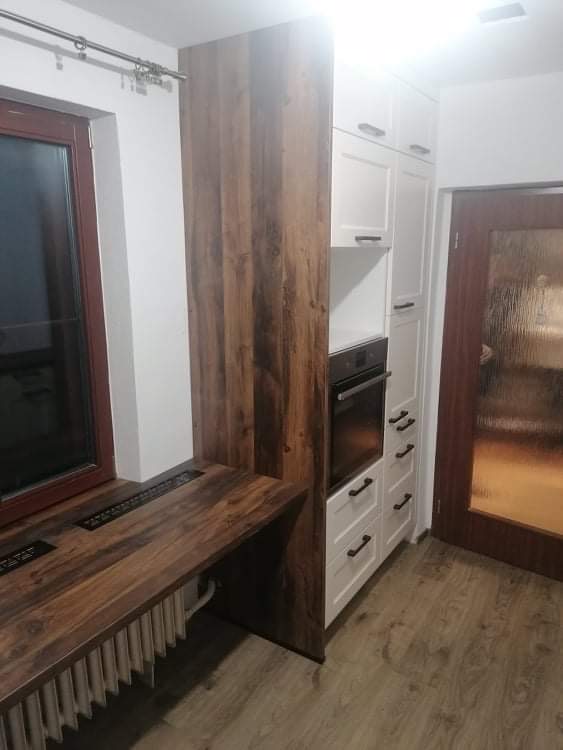 Zákaznice měla velké přání, a to efektivně využít každý volný centimetr prostoru a pokusit se navrhnout nějaké sezení přímo začleněné do kuchyňské linky. Z našich návrhů se zrodila elegantní a prostorná kuchyně na míru s velkým úložným prostorem. Klasickou a domácky vyhlížející linku v příjemném odstínu Magnolia v matném lakovaném provedení doplňuje pracovní deska v tmavém dekoru dřeva, která byla použita i jako obklad nad pracovní plochou. Jak si můžete prohlédnout ve fotogalerii, do kuchyně se nám podařilo začlenit i útulný snídaňový/jídelní kout umístěný před oknem.