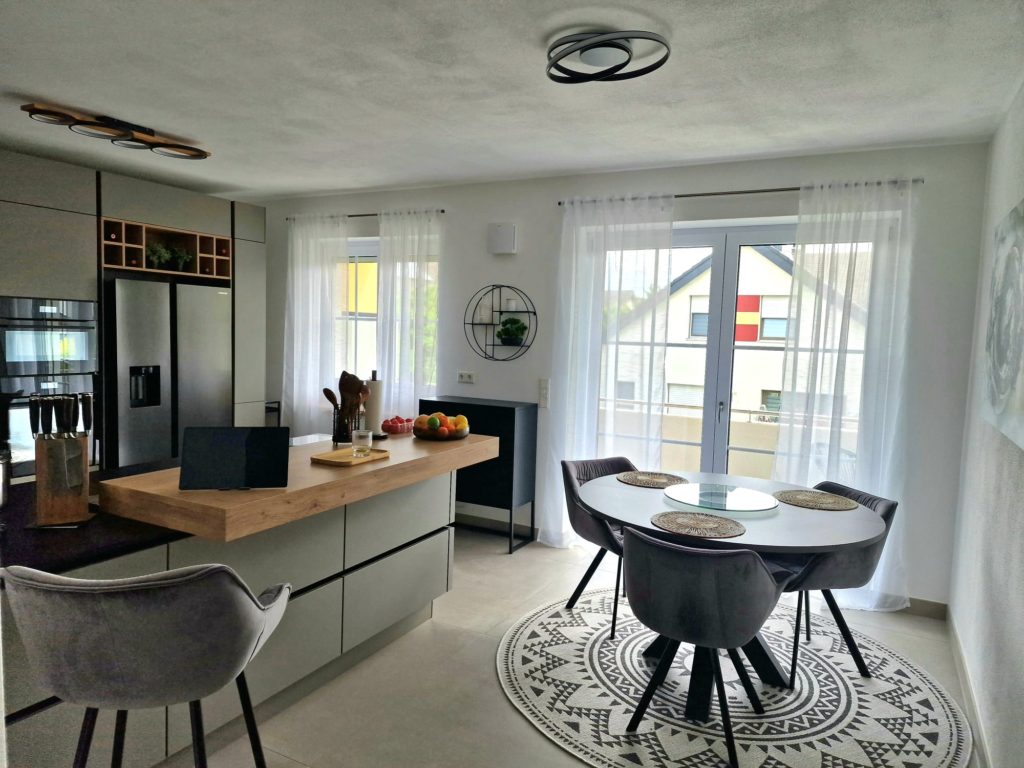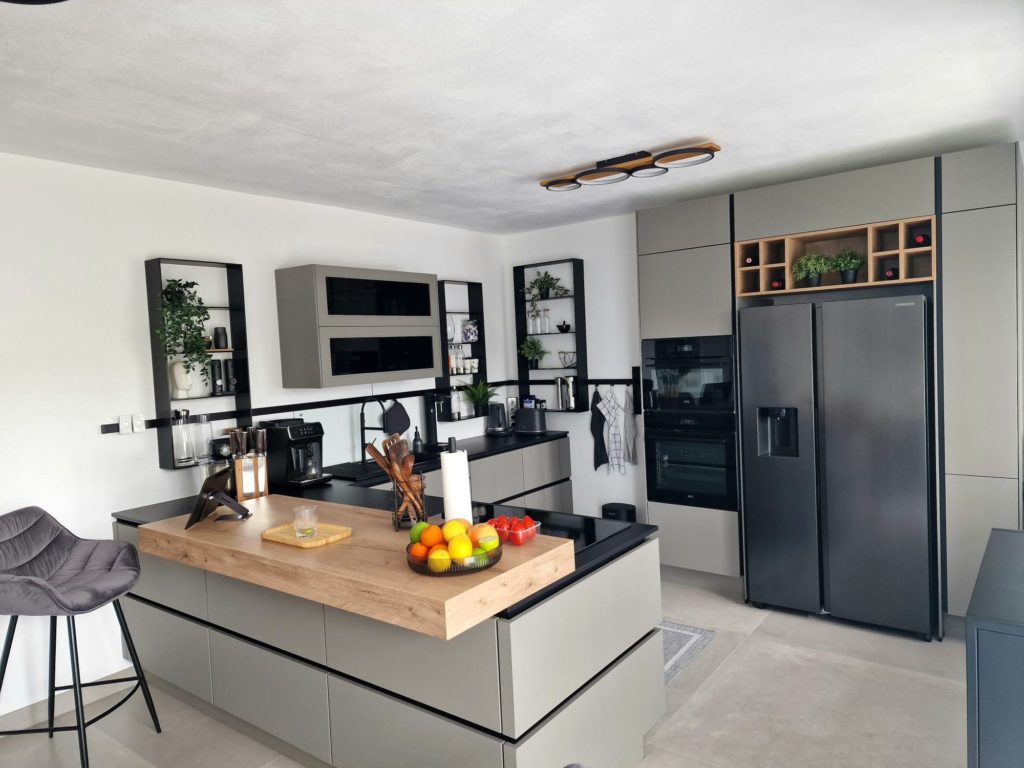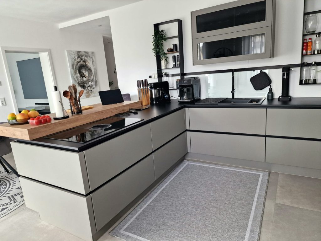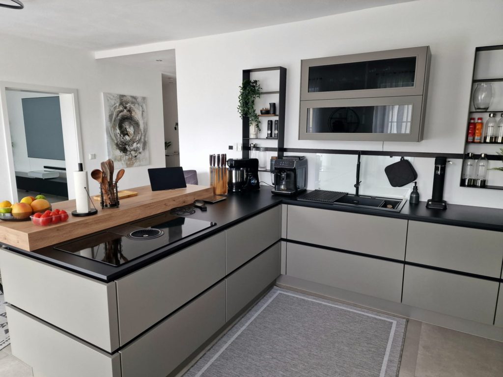 Kuchyně na míru pro novomanžele v Německu. Klient měl požadavek , odlehčený styl kuchyně s materiály v jemném šedém odstínu. Pracovní plocha je tmavě černá a má strukturovaný povrch. Zařízení splňují nejvyšší kvalitu od značky AEG a varná deska s odsávačem par od společnosti Elica.