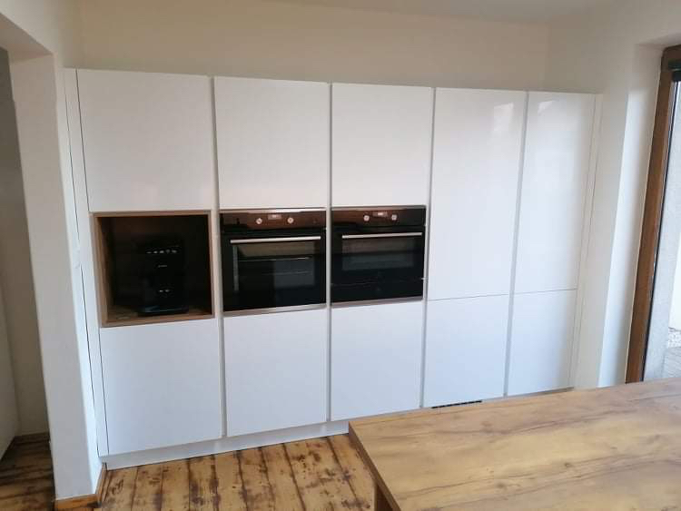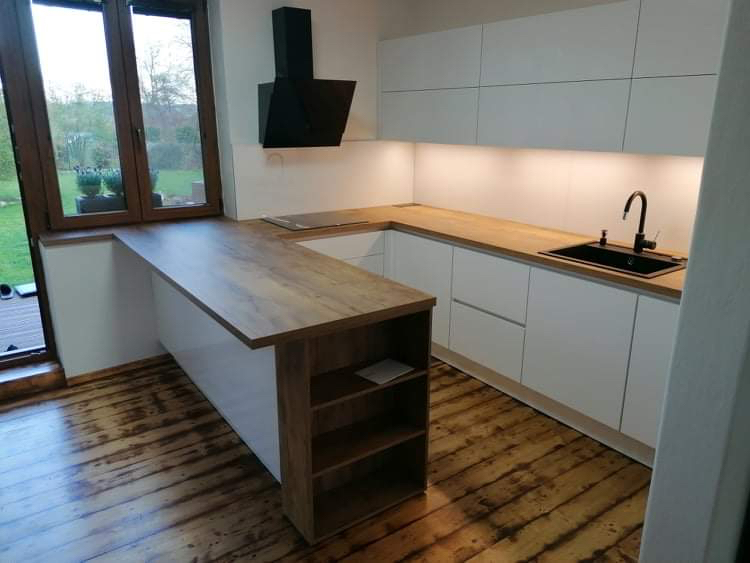 Jsme neskutečně šťastní, když se k nám zákazníci vracejí. Spokojenému zákazníkovi, kterému jsme pomohli ke kuchyni snů už před devíti lety, jsme nyní měli možnost navrhnout linku v novém rodinném domě. Mladá rodina měla o své budoucí kuchyni jasnou představu – lesklá bílá kuchyňská linka s pracovní deskou v dekoru dřeva. Konečná volba padla na moderní a jednoduchou bezúchytovou kuchyňskou linku a příjemný, teplý odstín dřeva. Celek doplňuje obkladová deska z bílého kaleného skla a velmi trendy černé doplňky.