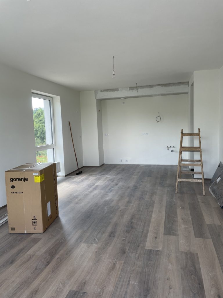 Bílá kuchyně s betonovou deskou