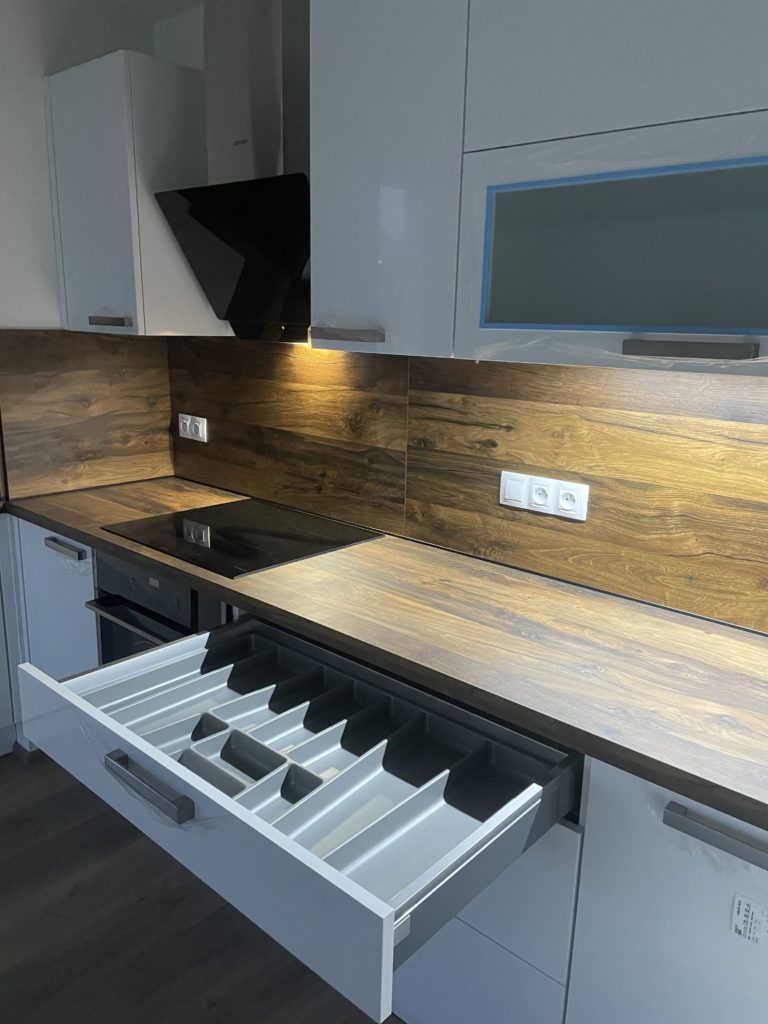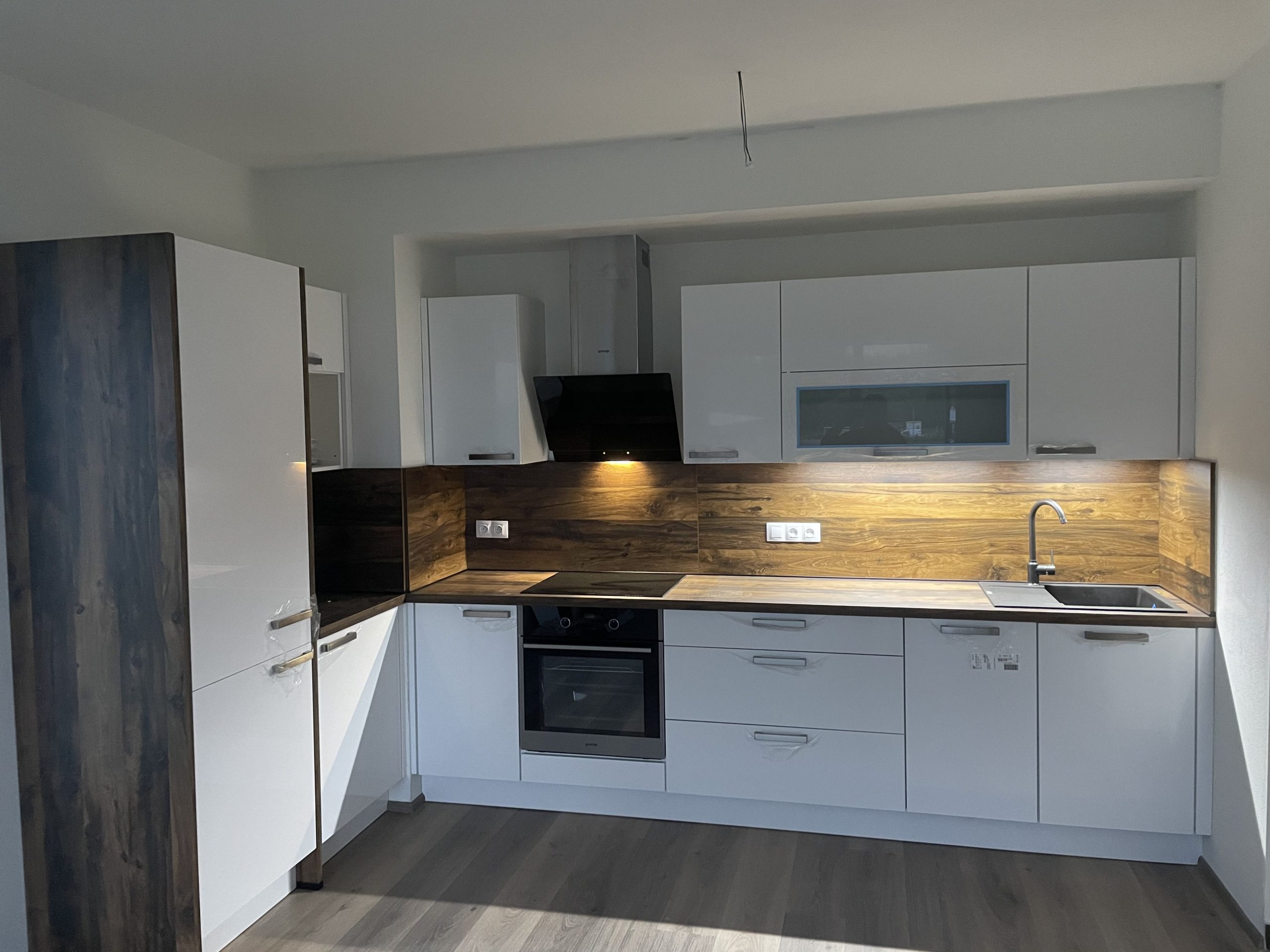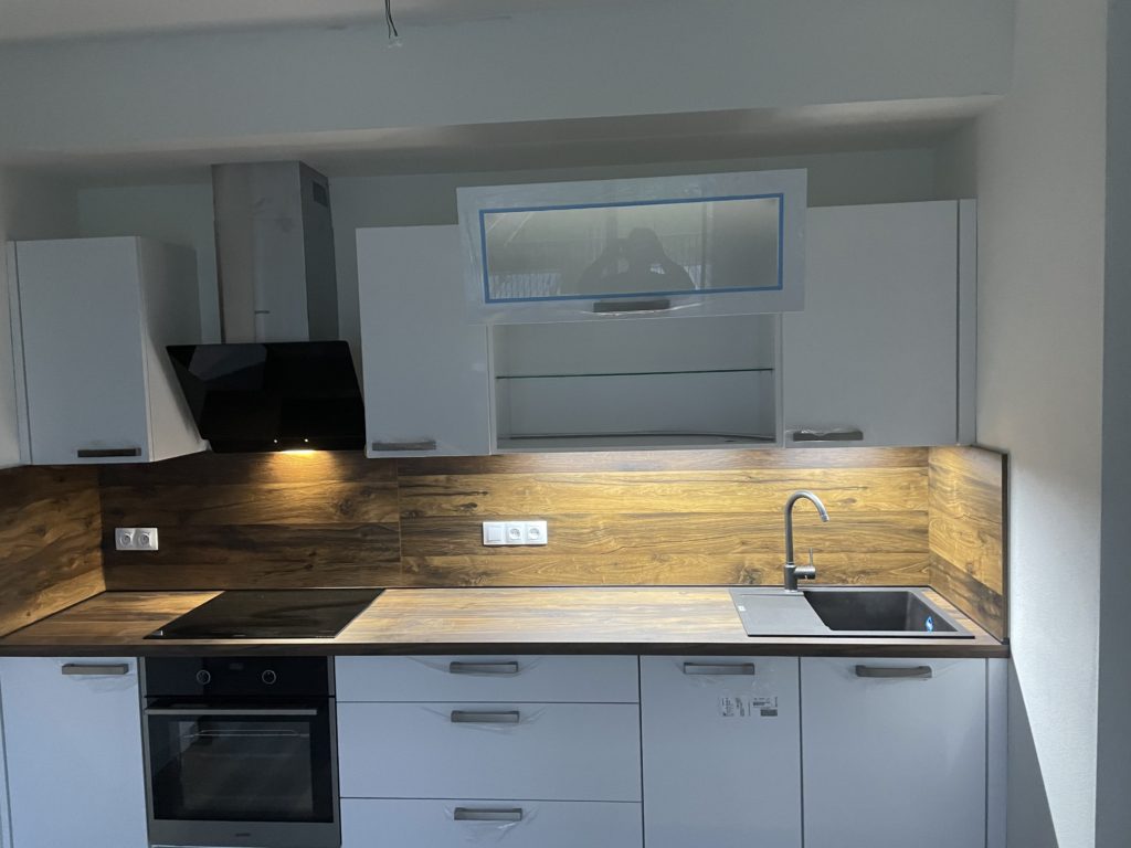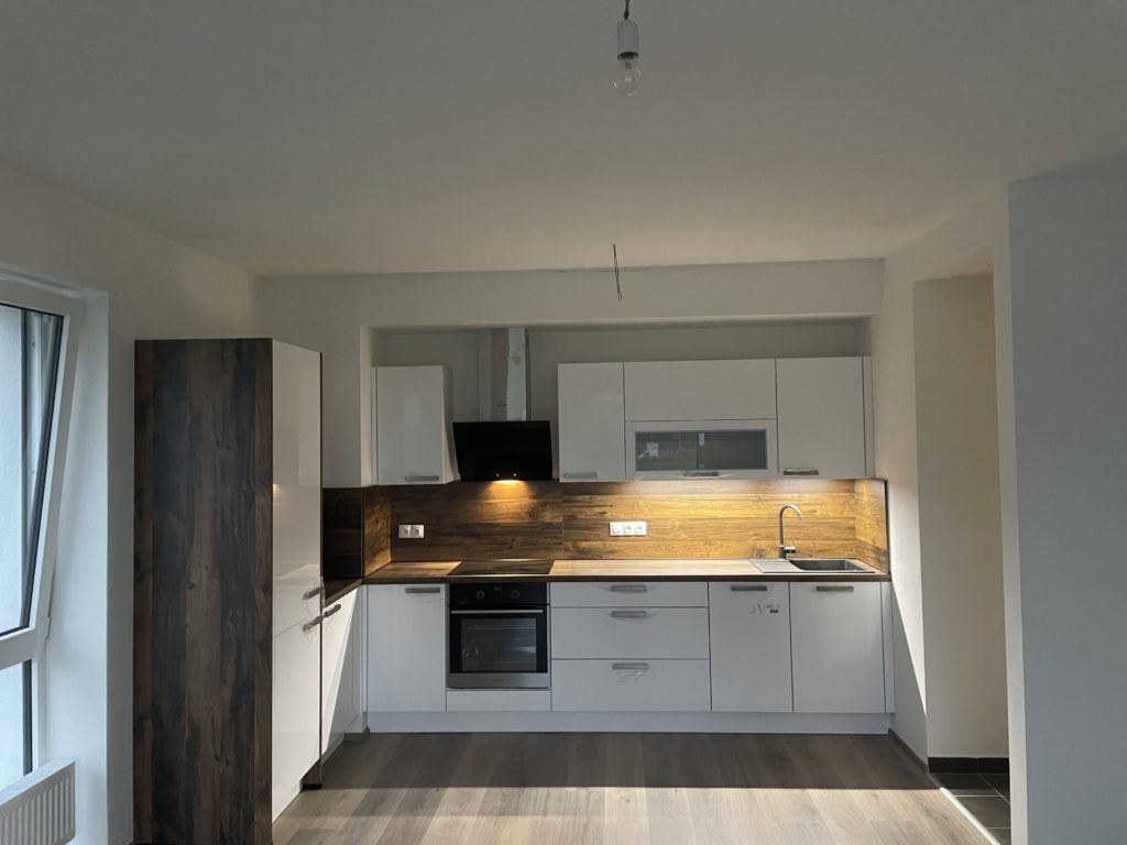 i taková může být rekonstrukce kuchyně ve spolupráci s naším studiem! Kuchyni, kterou jsme instalovali do nového domova našeho klienta v plzeňských Křimicích, tyto zmíněné atributy rozhodně nechybí. Ze všech variant zvítězila kuchyňská linka ve velmi vkusné a designově svěží kombinaci lesklých bílých skříněk a tmavšího dekoru dřeva, který byl použit na kuchyňské pracovní desce a obkladu nad ní. Linka nabízí dostatek úložného i pracovního prostoru a nechybí jí ani moderní vestavěné spotřebiče. V téhle kuchyni se jistě bude vařit ve velkém stylu!